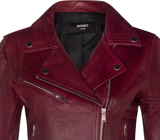 Ladies Classic Biker Leather Jacket — Real Nappa Leather (Burgundy)