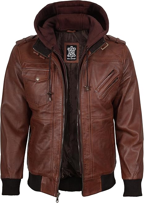 Men’s Leather Bomber Jacket – Motorcycle Style with Detachable Hood | 100% Real Leather